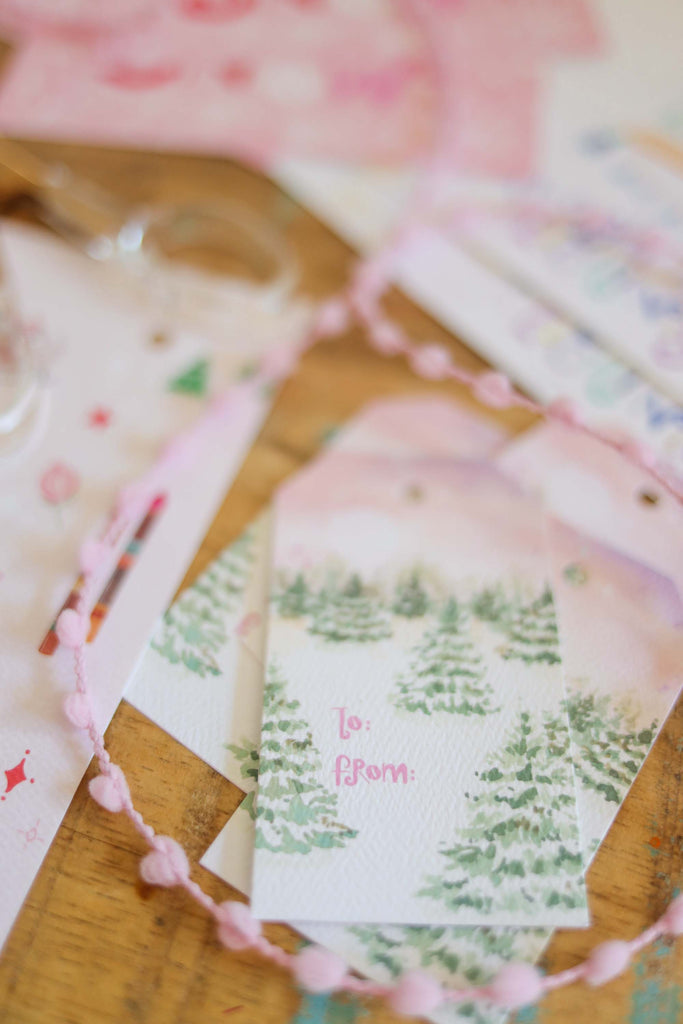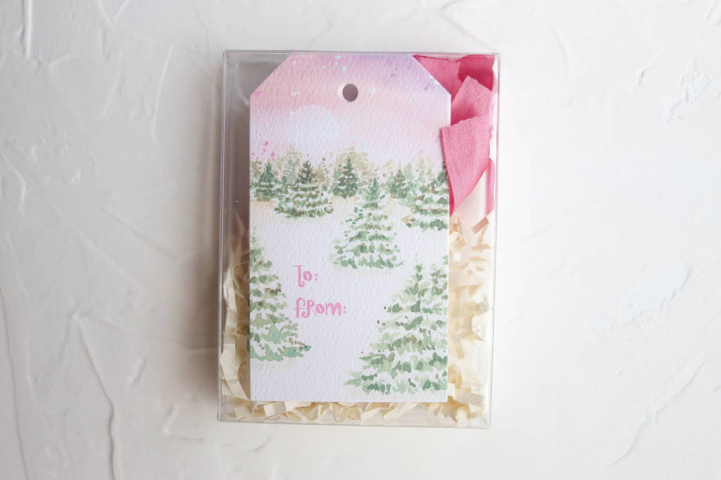 Christmas tree farm gift tags! Hand painted Christmas tree farm with a beautiful cotton candy sky to add some pzazz to your holiday gift wrapping this year!