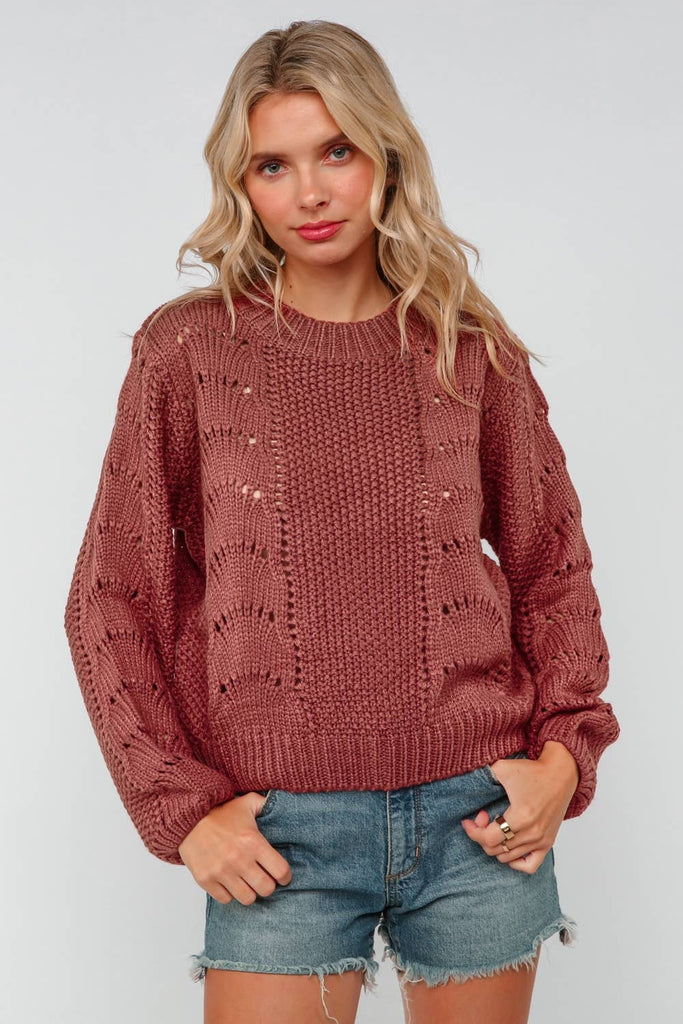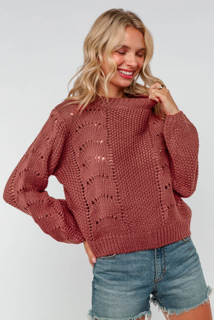 COASTAL CROCHET SCALLOP SWEATER IN RUST